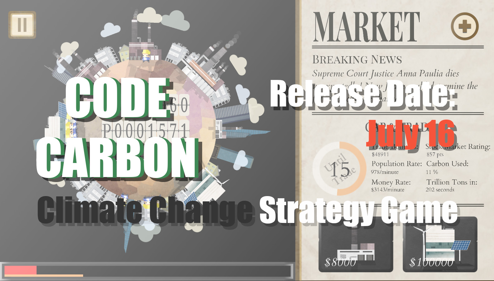 Code Carbon is a free to play climate change strategy game where you develop and civilization with economical, political, and environmental constraints! It will be available on the android app store and the IOS app store. The release date is July 16th! You'll get a special package between July 16th and 23rd. Be sure not to miss it!
